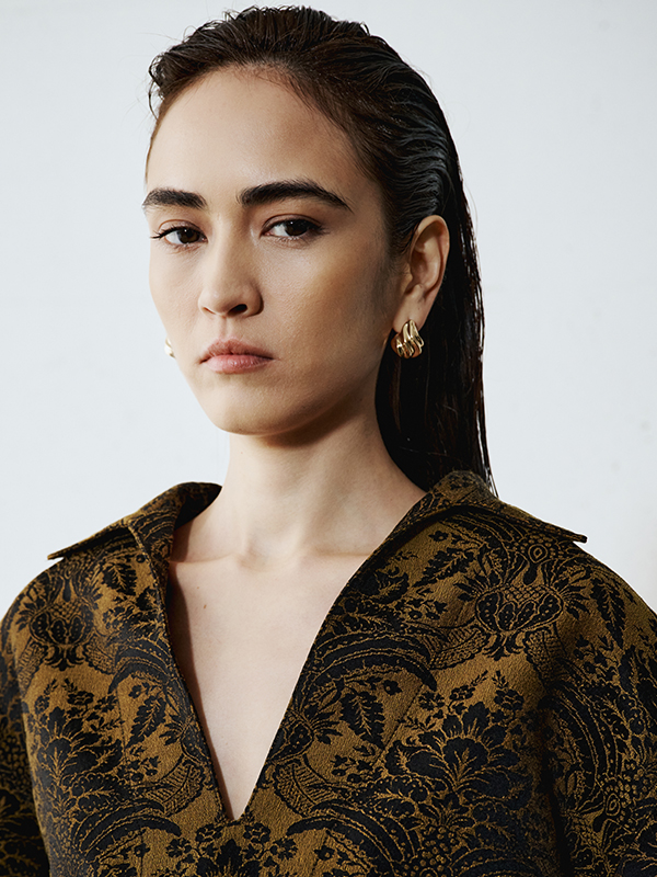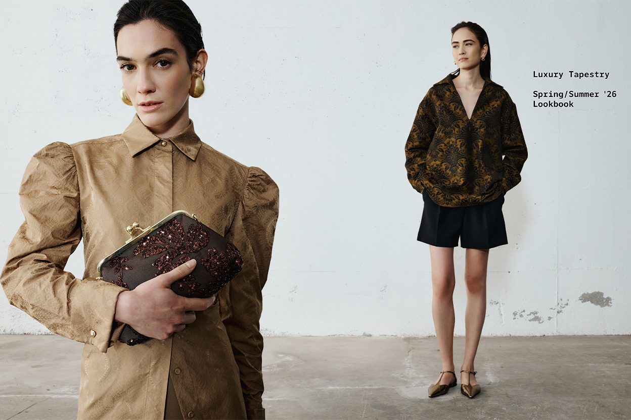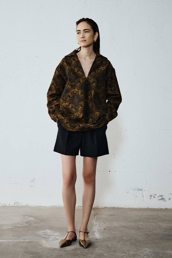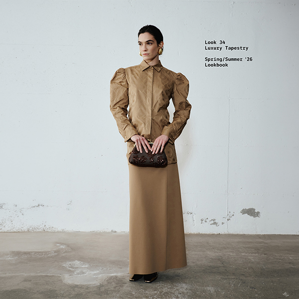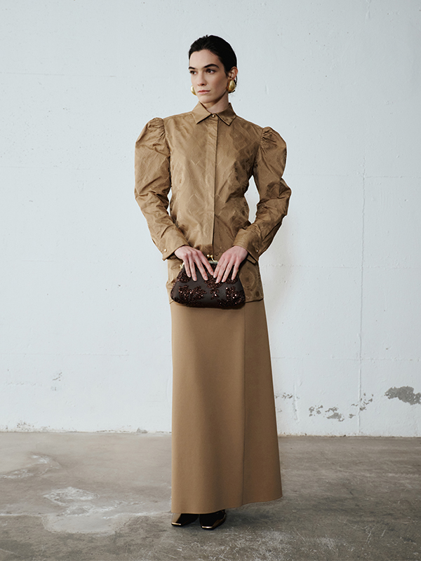 The secret is in the mix. Pair the gold jacquard shirt with a long, minimal skirt to balance the volumes of the puff sleeves.