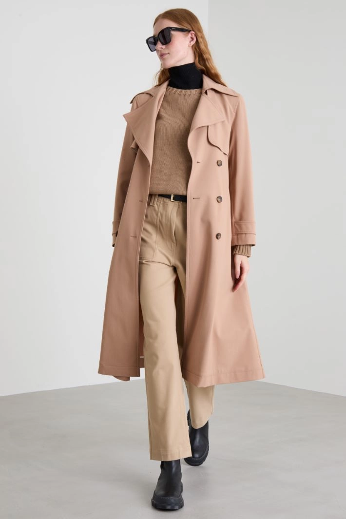 Regular-fit trench coat in wool blend twill, with lapel collar, long sleeves with toggles at the cuffs, welt pockets at the sides, cape and slit at the back. Matching belt and double-breasted fastening with buttons.