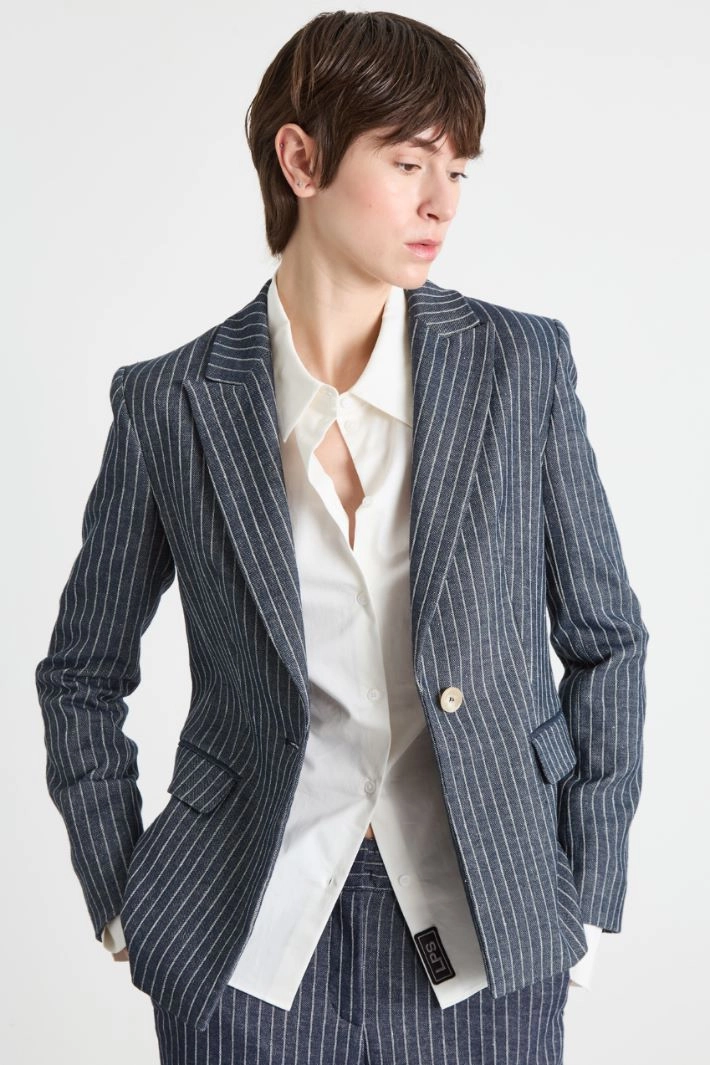 Fitted blazer in stretch cotton and linen twill, with peak lapels, long sleeves with vented cuffs and flap pockets. Lined. Single-button fastening.