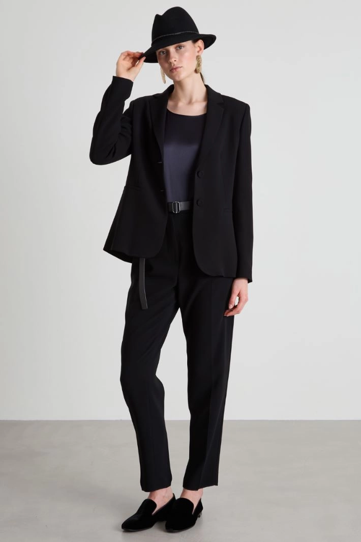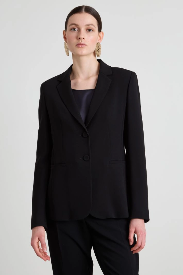 Fitted blazer in flowing fabric, with lapel collar, long sleeves, welt pockets on the sides and central vent on the back. Button fastening. Lined.