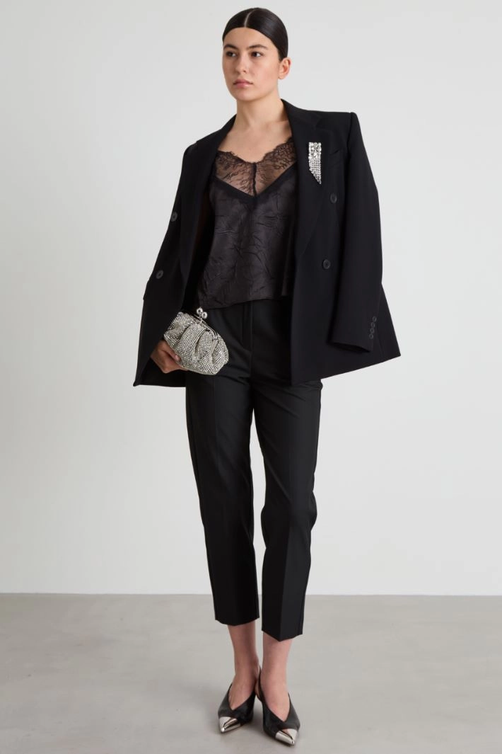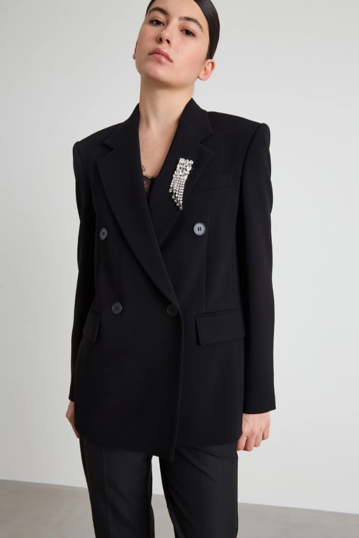 Straight-fit cady blazer with lapel collar, long sleeves with buttons, welt pocket on the chest and flap pockets on the front, and vent on the center back. Double-breasted fastening with buttons. Lined garment.