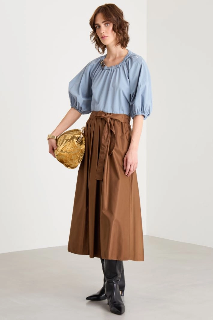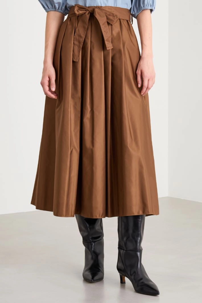 Full-length taffeta skirt with an elastic waistband, a pleated design sewn into the front waistband, side slit pockets, and an invisible zip fastening at the side. Matching sash.