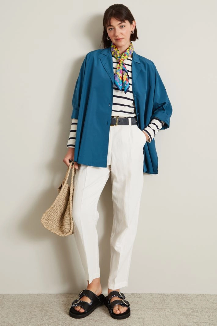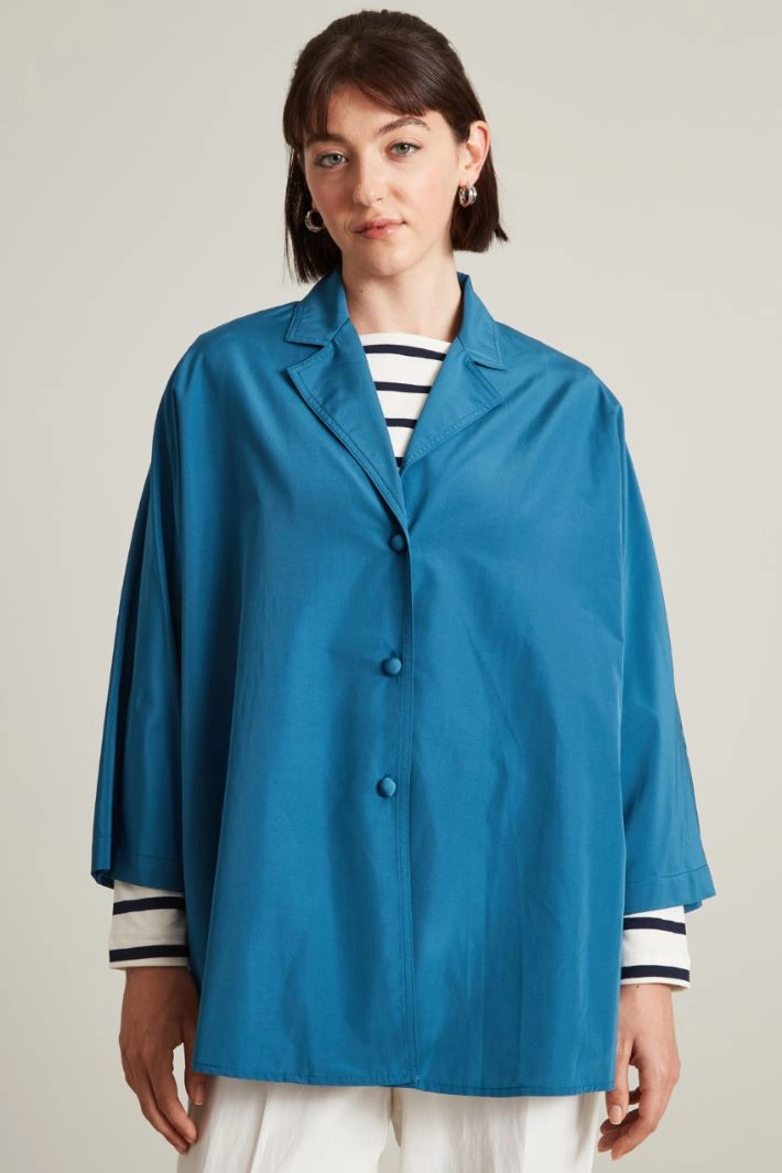 Straight-cut tunic in cotton taffeta, with lapel collar and three-quarter kimono sleeves. Side slits. Button fastening.