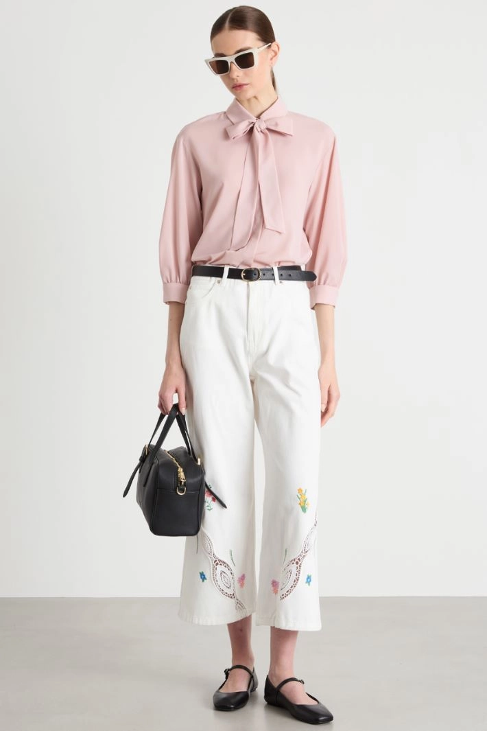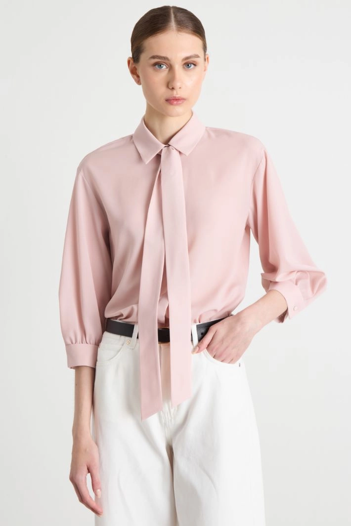 Flowing blouse in crepe de chine, with a pointed collar, a detachable scarf, three-quarter length sleeves with buttoned cuffs, and a back yoke with gentle gathering. Concealed button fastening.