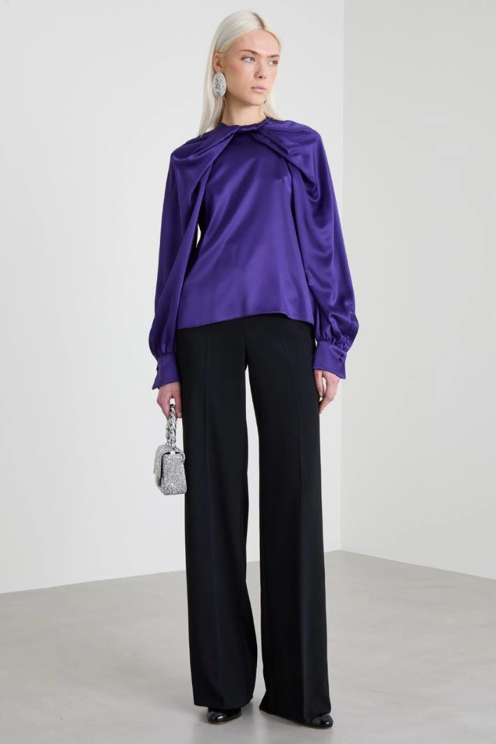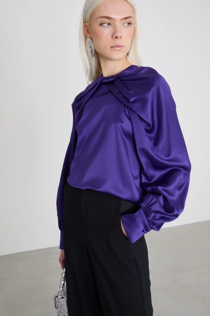Flowing blouse in pure silk satin, with round neckline and knotted motif, long sleeves with cuff and button. Teardrop fastening with button.