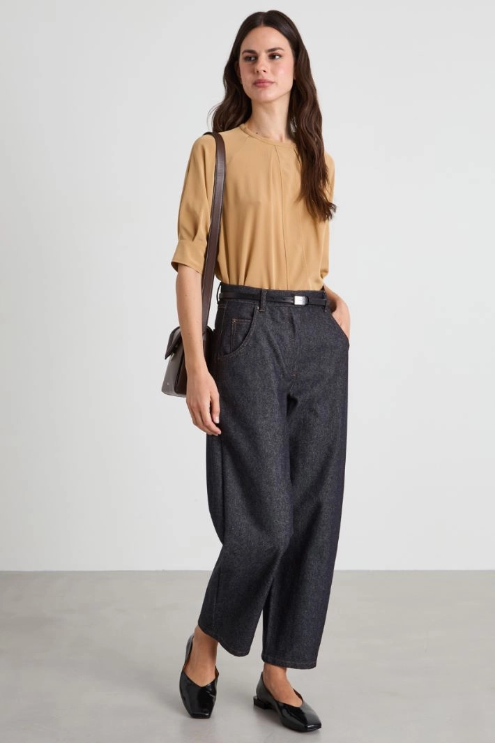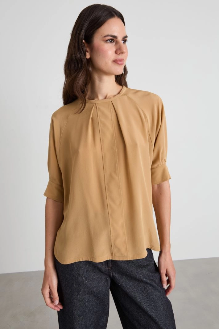 Straight-cut blouse in pure silk crepe de chine, with a pleat motif on the front, crew neck, short sleeves with cuffs and button, and side slits at the bottom of the garment. Zip fastening on the back.