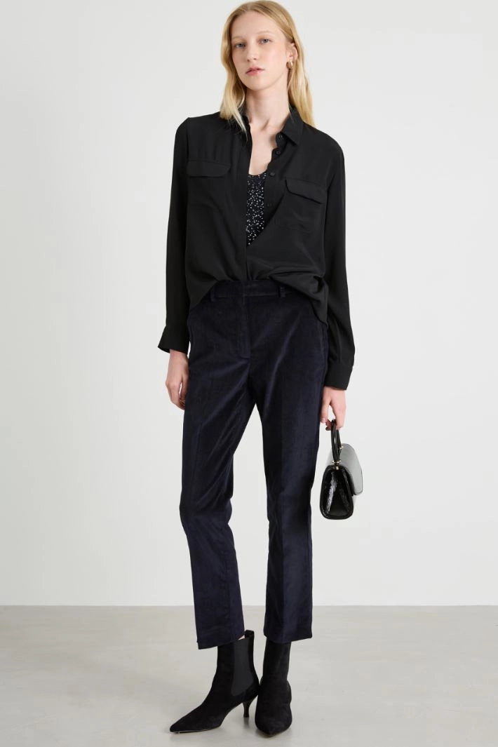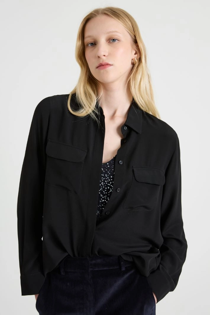 Flowing shirt in silk blend crepe de chine, with shirt collar, long sleeves with cuff and button, and chest pockets with flap. Yoke cut with box pleat on the back and hidden button fastening.