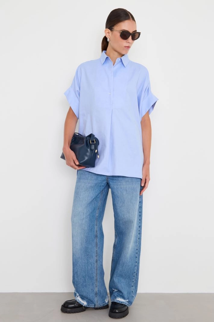Straight-fit shirt in pure cotton Oxford, with a classic collar, short kimono sleeves with turn-ups, a back yoke with a box pleat, and a longer asymmetrical hem at the back. Button fastening.