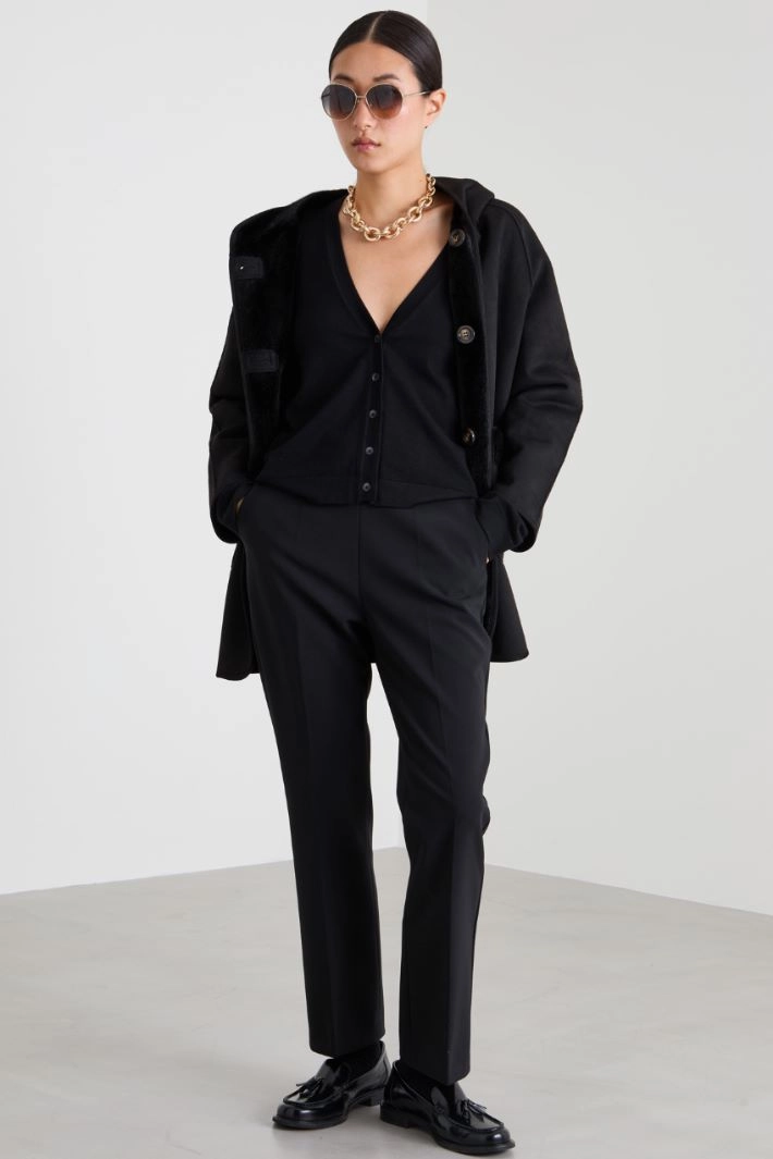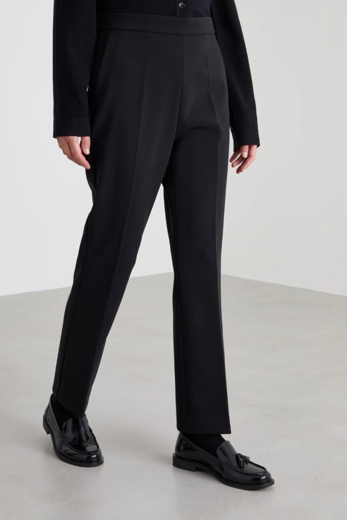 Slightly cropped, flared cady trousers with a lengthwise crease, side French pockets and fastening with an invisible zip and hook on the side.