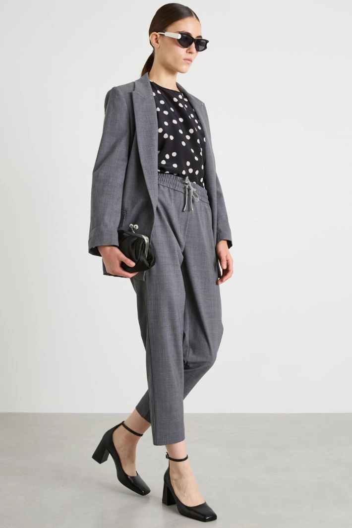 Baggy trousers in stretch wool blend canvas, with elastic insert and drawstring waist, inset pockets on the front and welt pockets on the back.