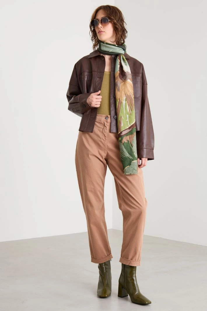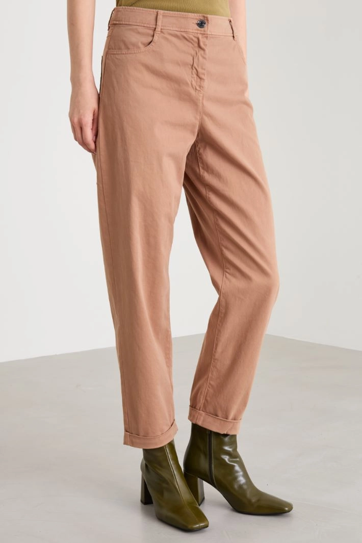 Straight-fit trousers in stretch cotton fabric, with belt loops at the waist, side French pockets and patch pockets on the back, rolled hem and fastening with hidden zip and metal button.