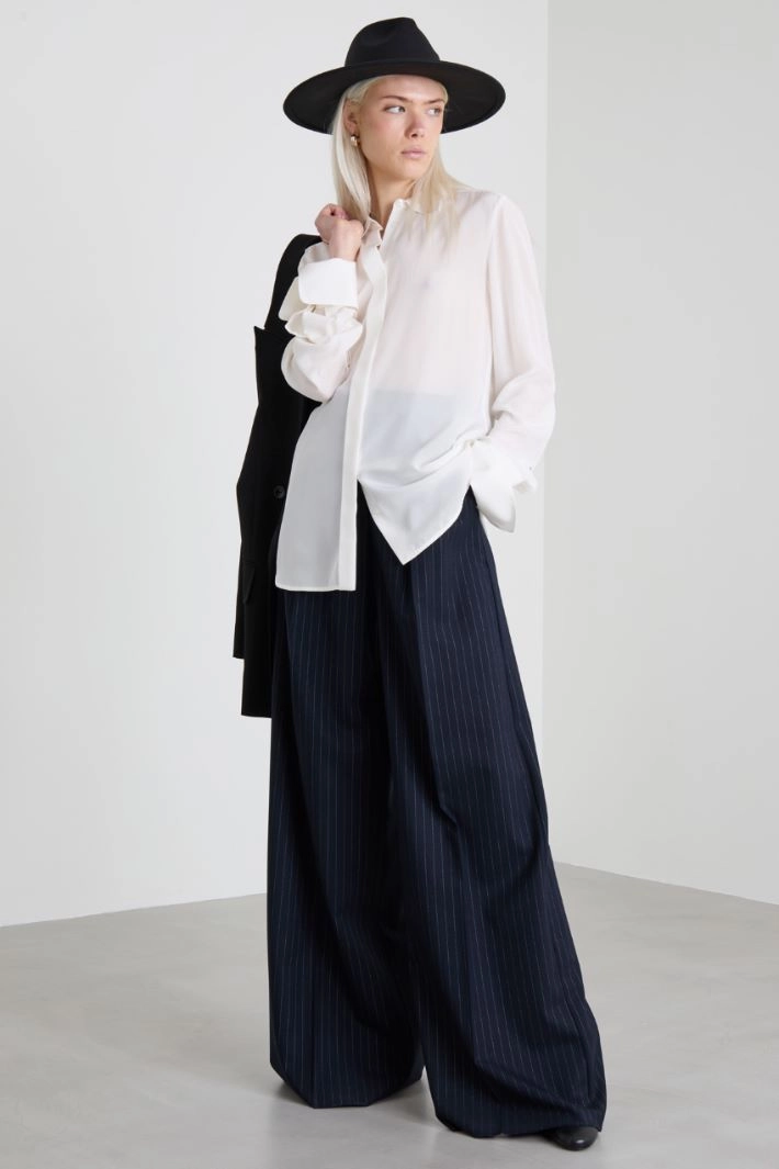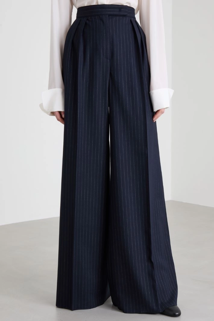 Wide-leg trousers in yarn-dyed stretch wool pinstripe fabric, with pleats, side French pockets and buttoned welt pockets on the back, hidden fastening with zip, button and hook.