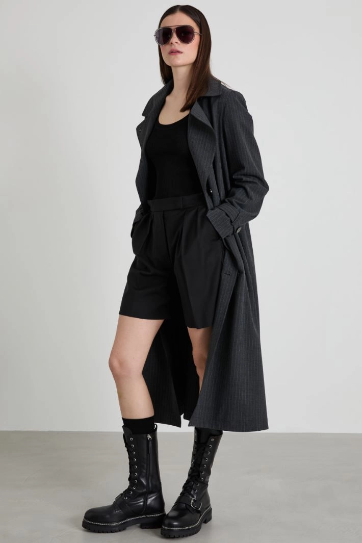 Flared shorts in lightweight pure wool canvas, with double pleats at the waist, side French pockets and welt pockets at the back, and crease ironed lengthwise. Hidden fastening with zip, button and hook.