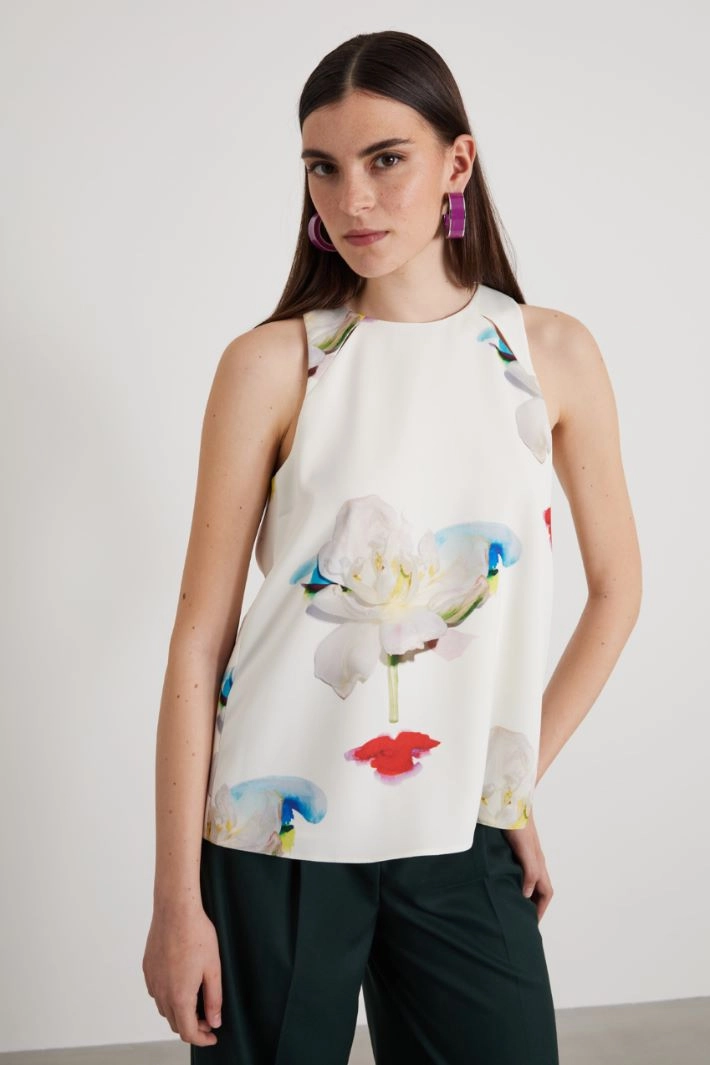 Flared envers satin top with a shiny finish printed all over, with crew neck and invisible zip fastening on the back. Lined.
