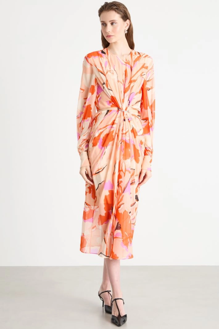 Flowing midi dress in pure silk georgette with an all-over print. This piece features a round neckline and long sleeves with a split detail on the underarm and button-fastening double cuffs. Draping at the front is secured by a metal ring, creating cut-out details at the sides and on the back. Finished with a keyhole button fastening at the back, a side zip and a zip on the back of the skirt.