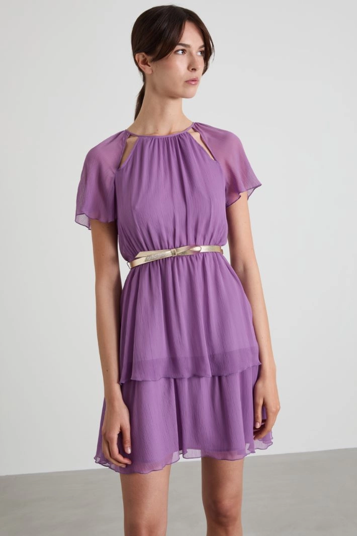 Loose-fitting dress in crépon, with a crew neckline, raglan sleeves with cut-out detail, a fitted waist and a flared skirt with overlapping flounces. Teardrop fastening with button and invisible zip at the centre back. Lined. Matching belt with bow.