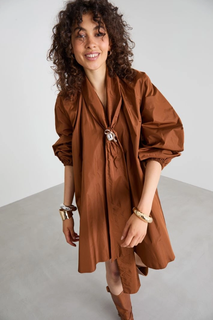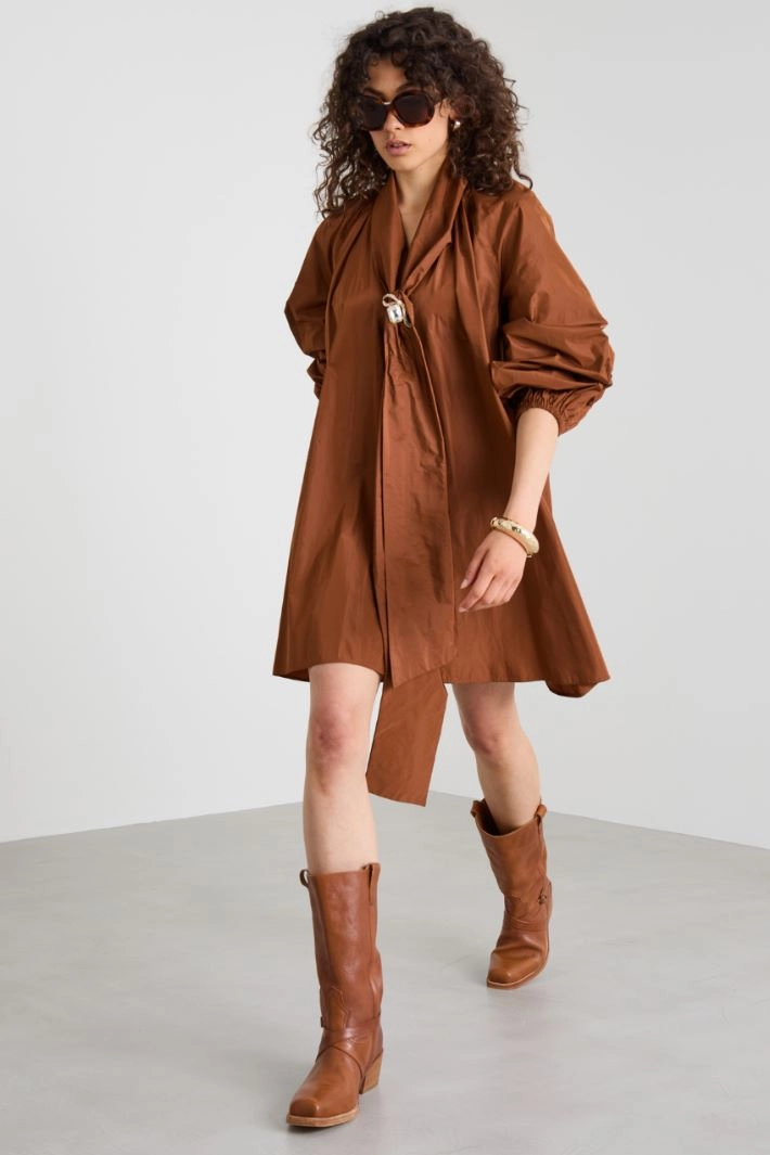 Wide, flared dress in silk-blend taffeta, with a self-tie scarf collar, puffed raglan sleeves with elastic cuffs and inset pockets.