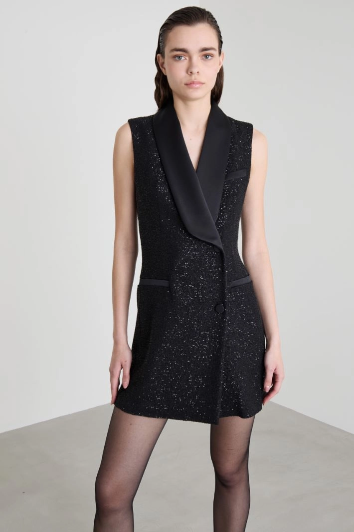 Regular-fit sleeveless dress in viscose and wool blend fabric, entirely embroidered with sequins, satin shawl collar, welt pockets on the chest and sides. Double-breasted fastening with buttons. Lined.