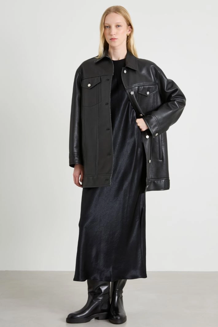 Long loose dress in flowing fabric, bare shoulders, halter neckline with drop and button fastening on the back.