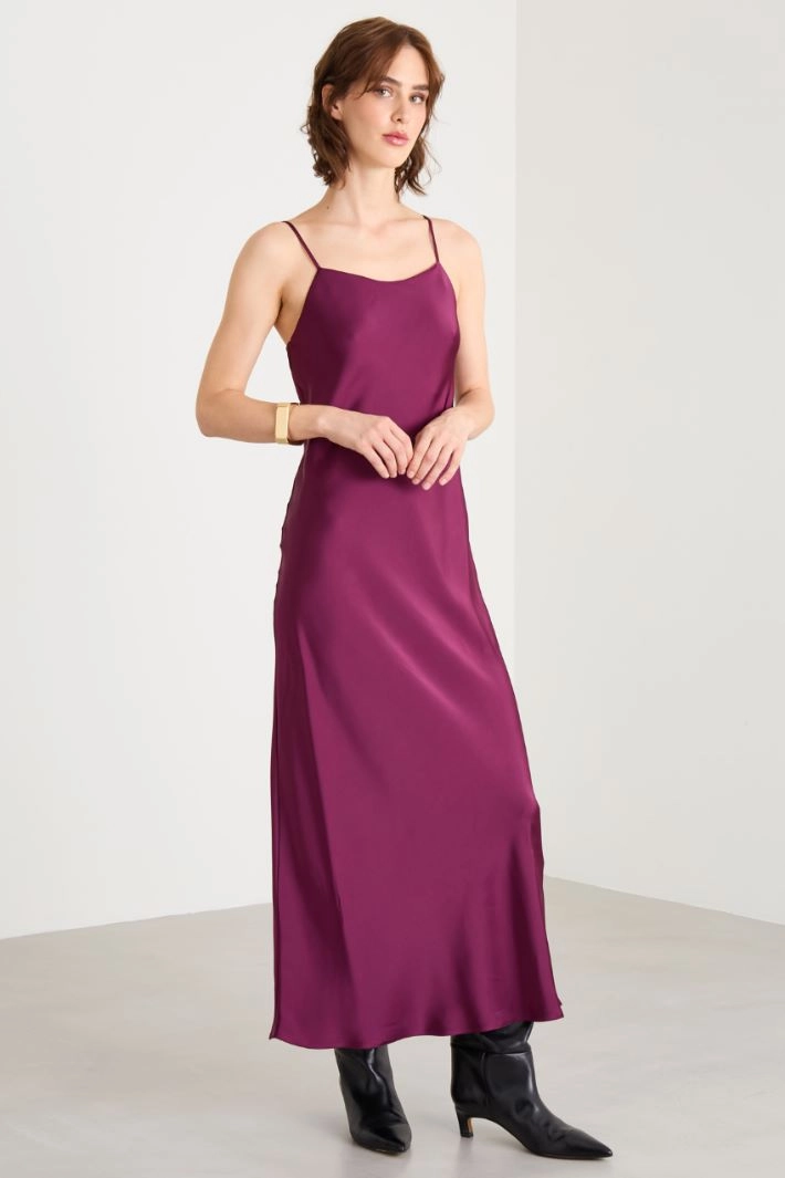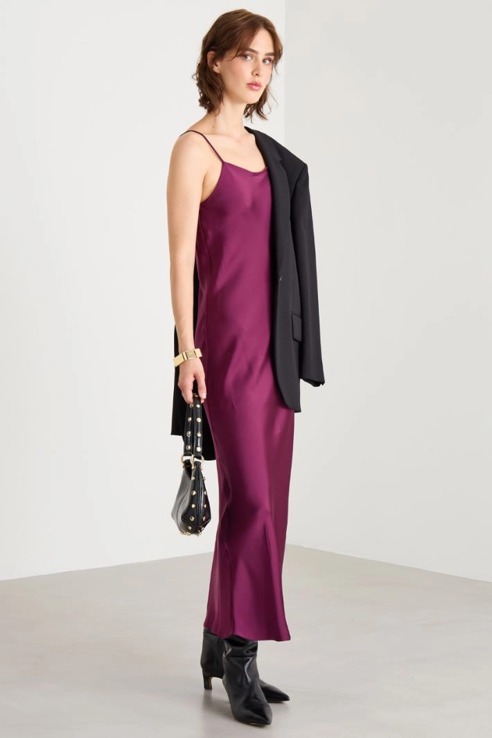 Slip dress in flowing satin, with soft neckline and thin shoulder straps.