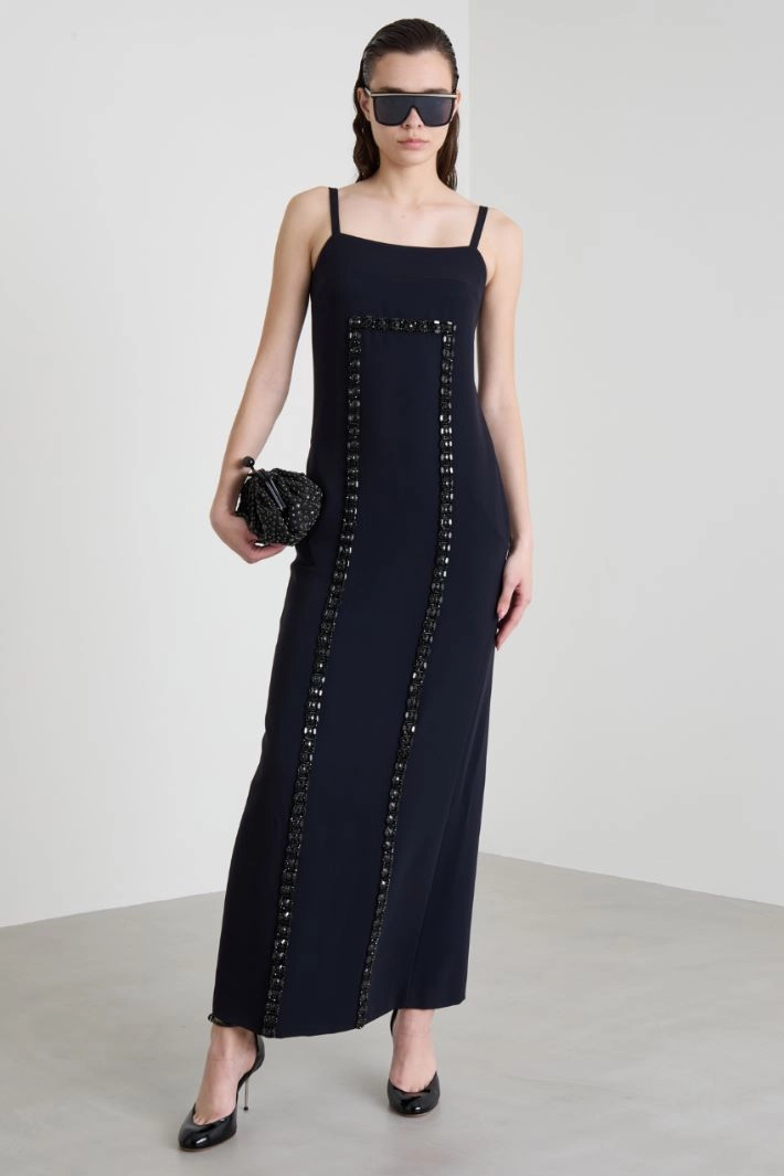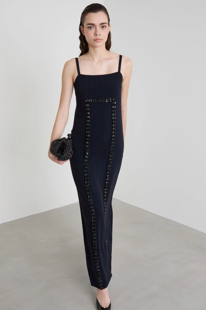 Long cady dress with embroidered stone and crystal detail on the front, square neckline, thin shoulder straps, inset side pockets, back pockets, slit on the back. Invisible zip fastening on the center back. Lined.