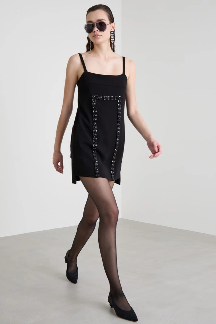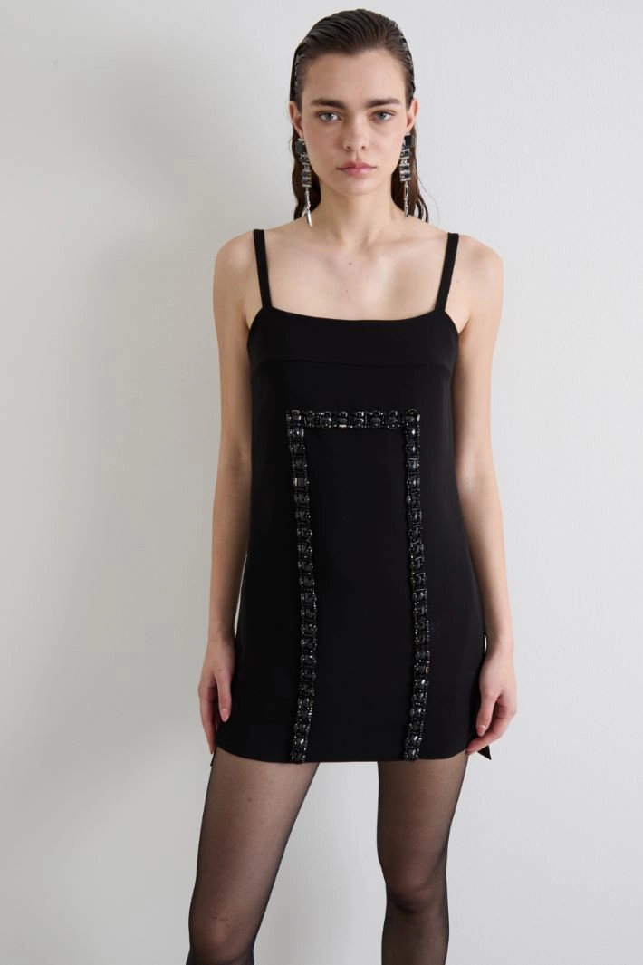 Short cady dress with embroidered stone and crystal detail on the front, square neckline, thin shoulder straps, inset pockets and back pockets. Asymmetrical bottom longer on the back with side slits. Invisible zip fastening on the center back. Lined.