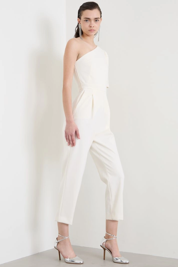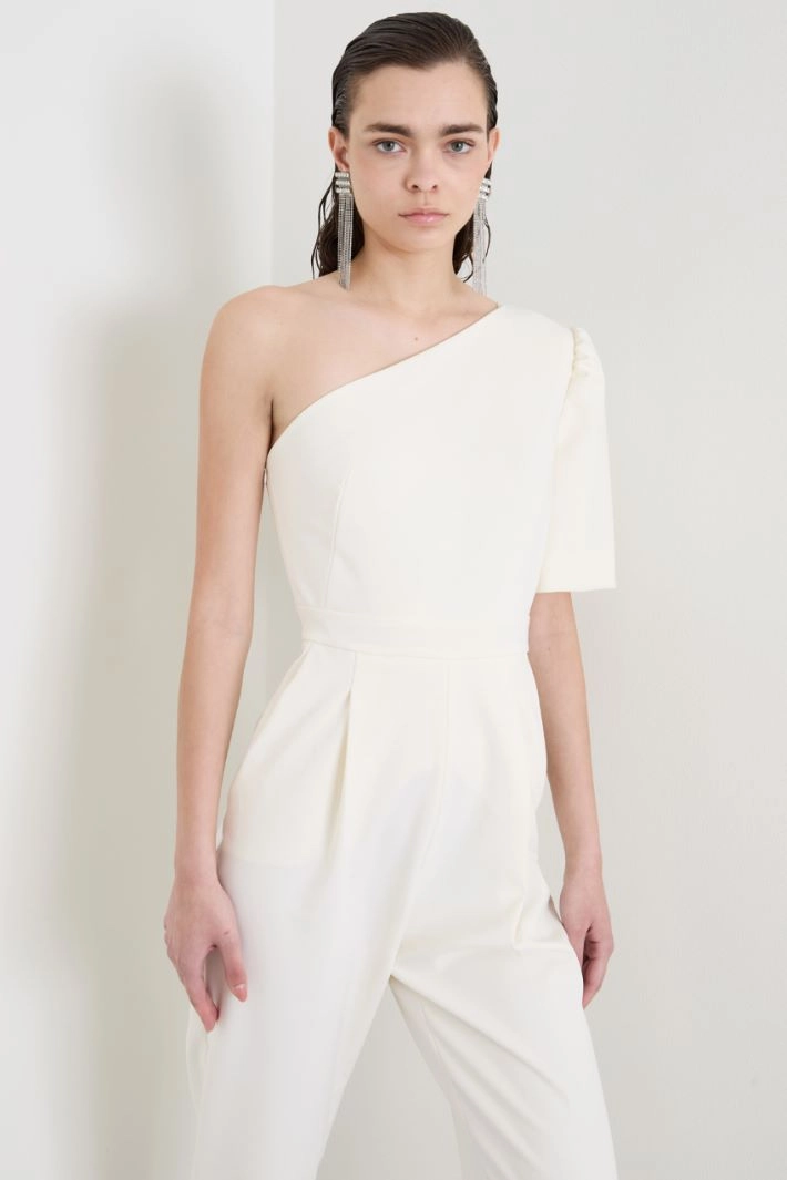 One-shoulder jumpsuit in stretch cady, with short sleeves, waist cut with stitched pleats, side French pockets and pressed pleat along the length. Invisible zip fastening on the side. Partially-lined.