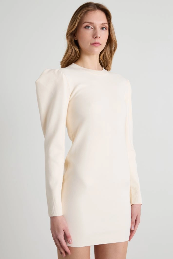 Short, fitted dress in compact viscose blend knit, featuring a crew neck, long sleeves with a puffed motif on the shoulders and ribbed trim.