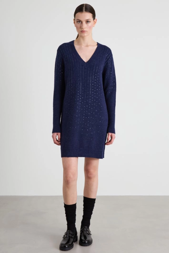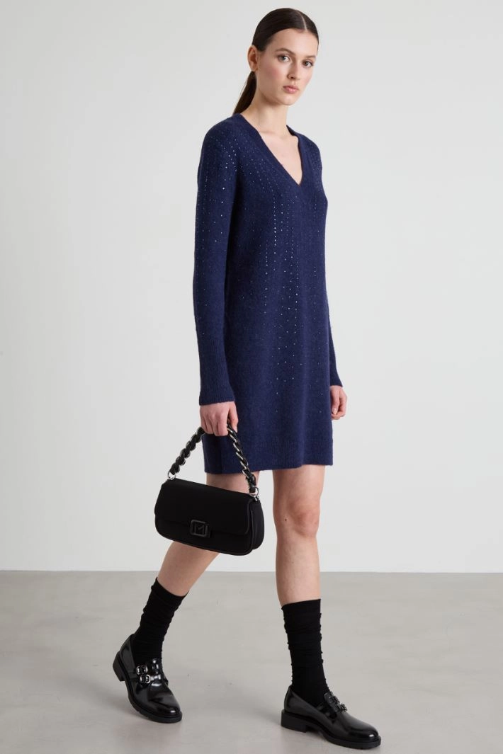 Straight-cut wool and alpaca blend dress with V-neck, long sleeves with high cuffs and ribbed edges.