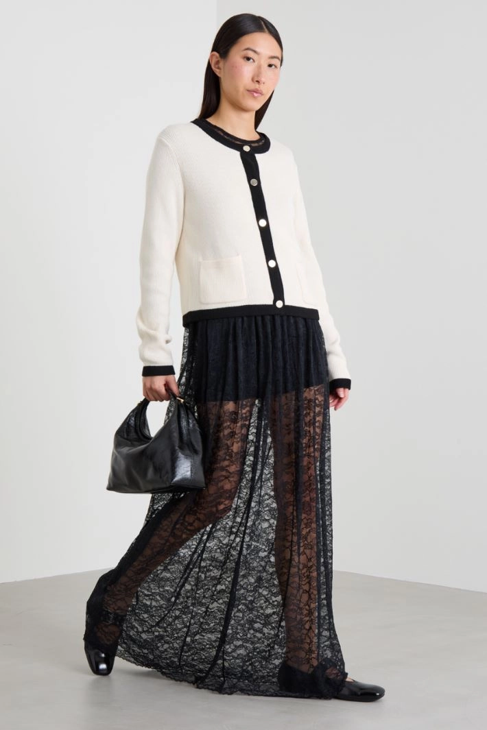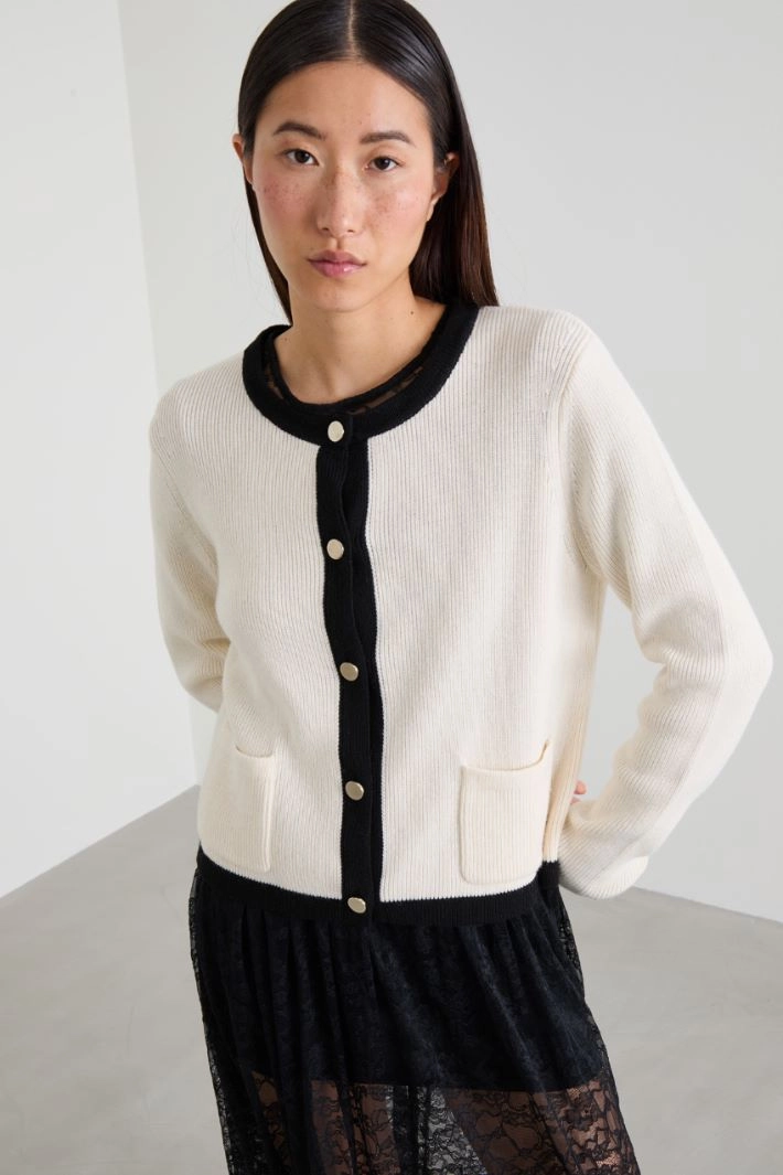 Straight-cut cardigan in viscose blend yarn, with ribbed knit, round neckline, long sleeves, patch pockets and fastening with visible metal buttons.