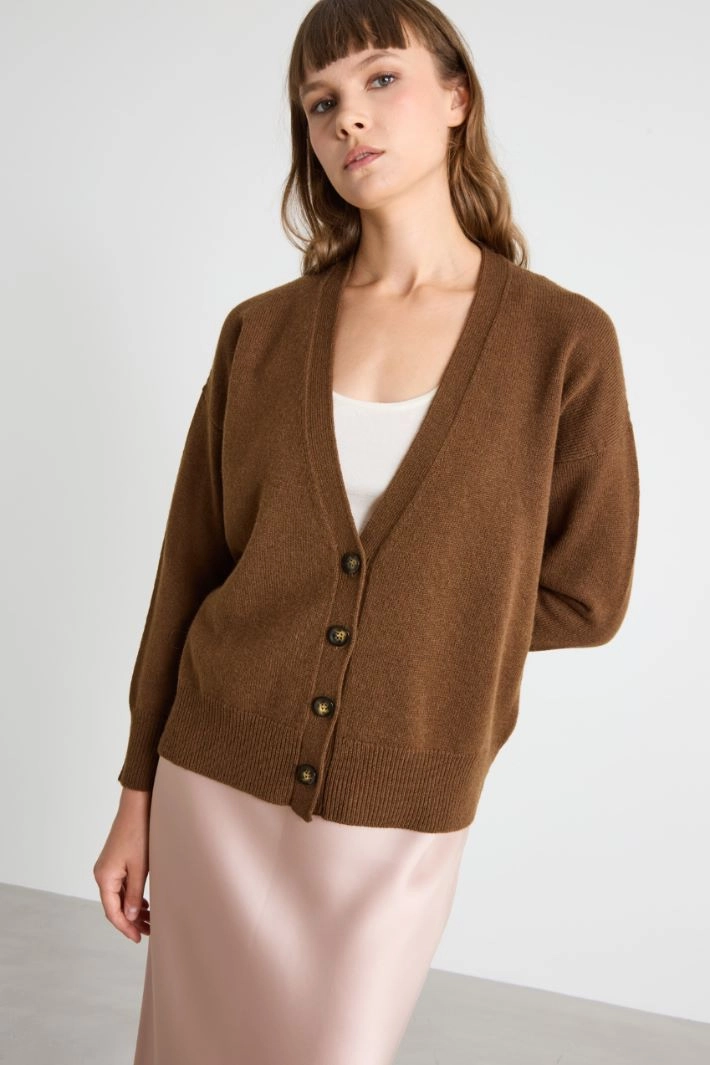 Boxy cardigan in wool and cashmere yarn, with a V-neck, long dropped sleeves and button fastening.