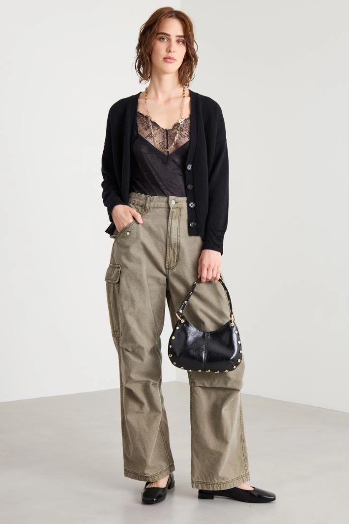 Boxy cardigan in wool and cashmere yarn, with a V-neck, long dropped sleeves and button fastening.