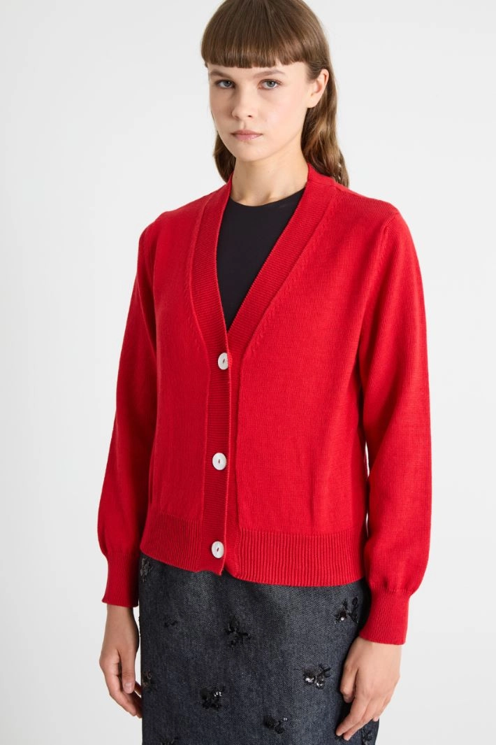 Regular-fit cardigan in pure cotton yarn, with a V-neck, long sleeves, ribbed trims and button fastening.