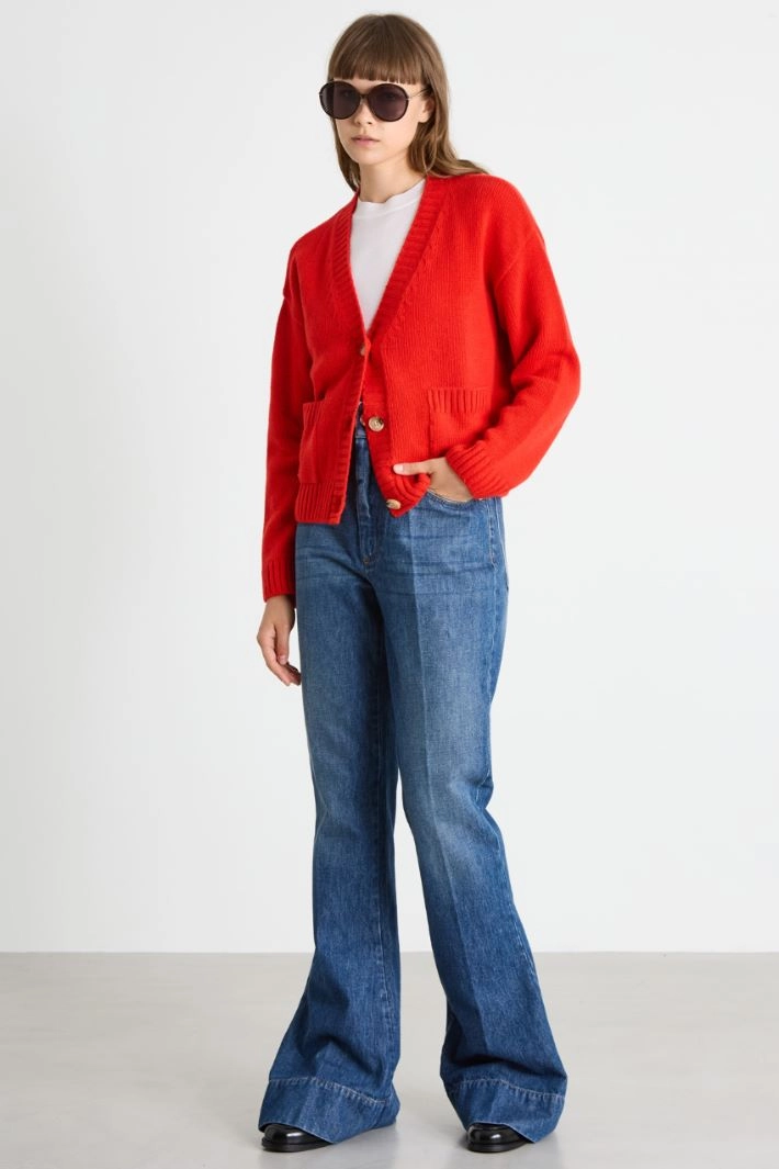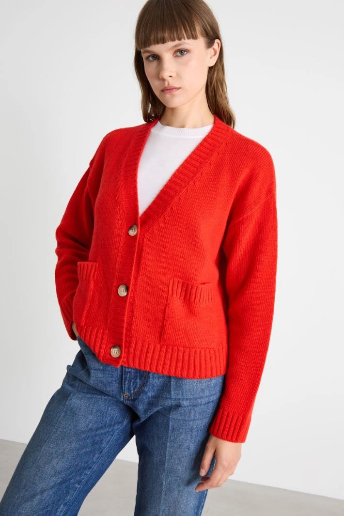 Straight-cut cardigan in wool, viscose and cashmere blend, with a V-neck, long dropped sleeves, patch pockets and ribbed trim. Fastening with visible buttons.