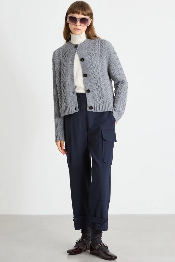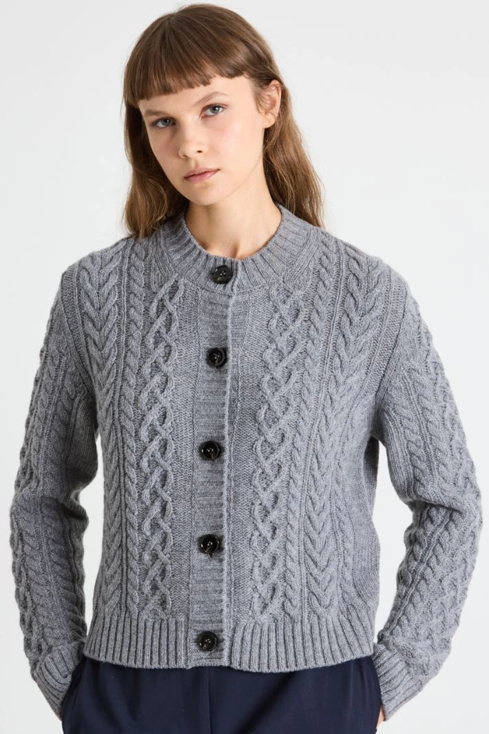 Straight-fit cardigan in pure wool with a cable knit, crew neck, long sleeves, and ribbed trim. Visible button fastening.