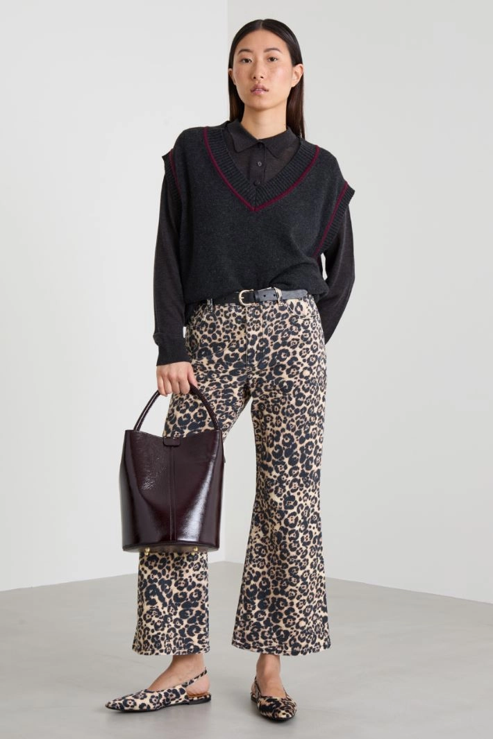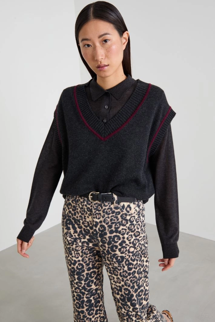 Loose-fit gilet in viscose blend yarn, with contrasting inlay pattern, V-neck, capped armholes and ribbed trim.