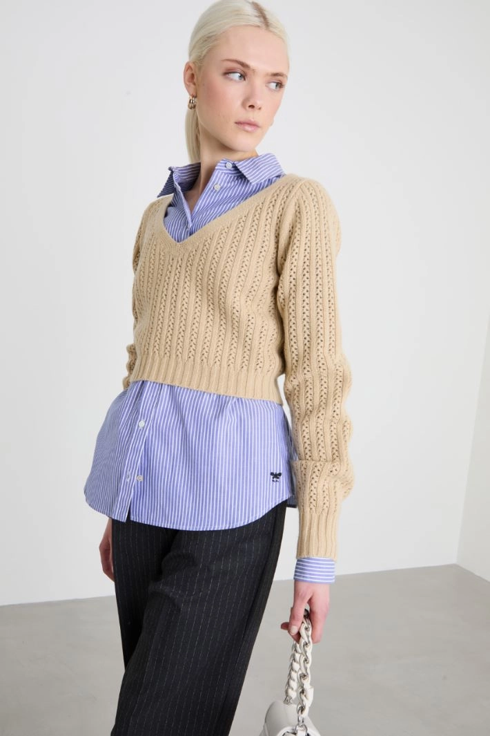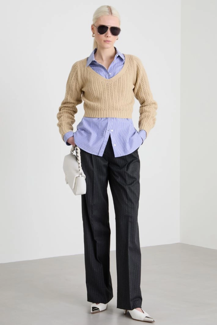 Cropped sweater with a tight fit in wool and cashmere yarn, with openwork details, V-neck, long sleeves and ribbed trims.