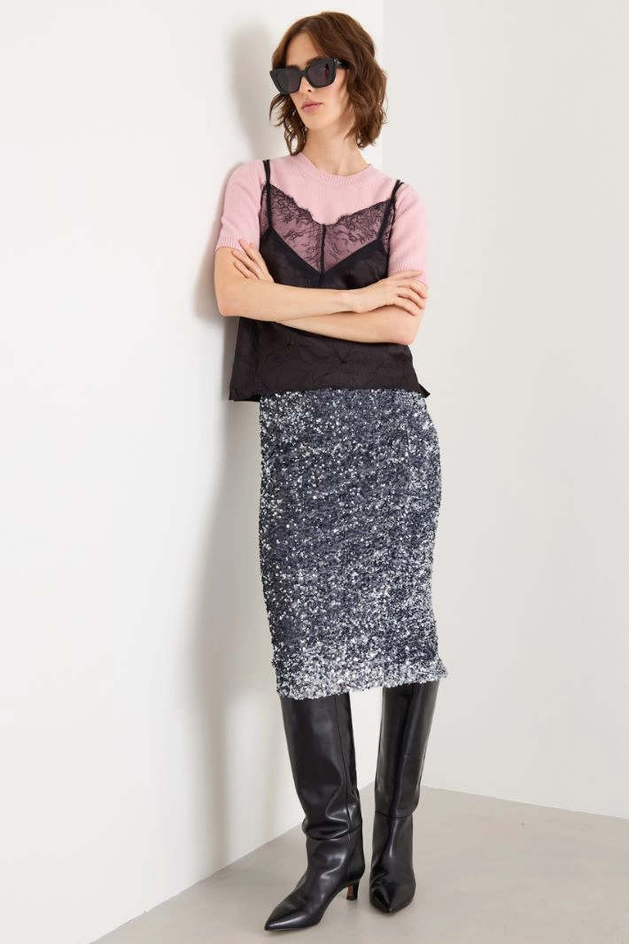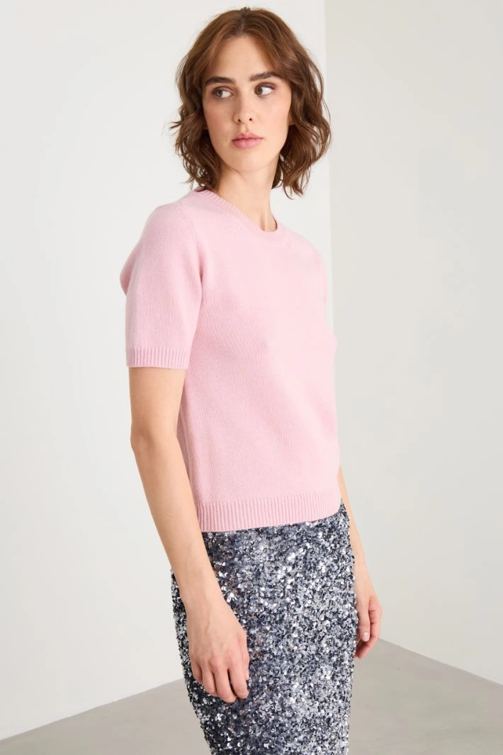 Fitted sweater in wool and cashmere yarn, with a round neck and short sleeves.