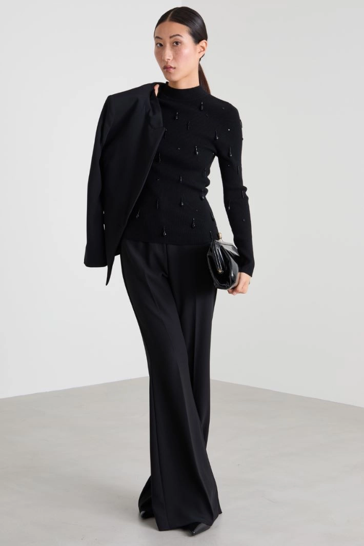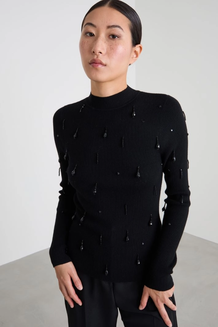 Fitted sweater in ribbed viscose blend with jewel embroidery on the front, high neck and long sleeves.