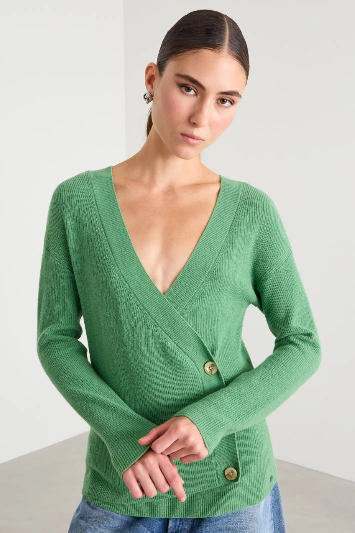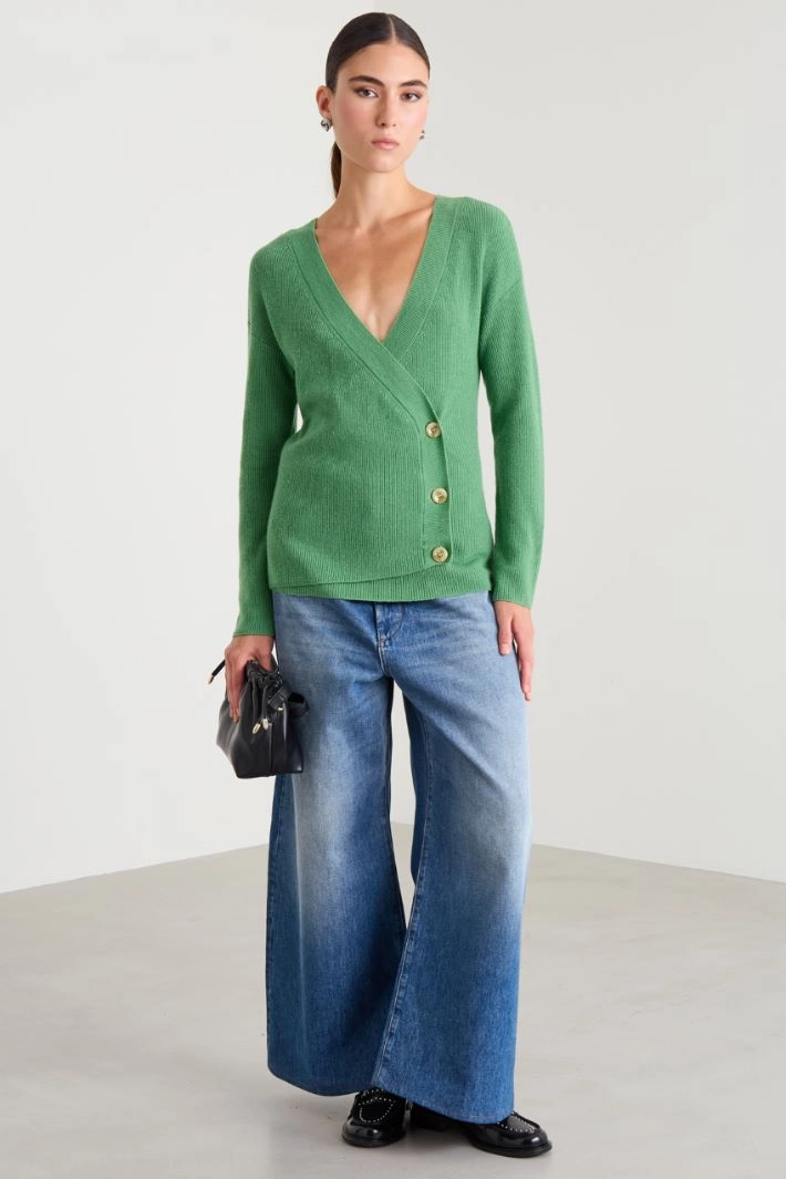 Semi-fitted sweater in mohair and viscose blend, V-neck with crossover, dropped shoulders and long sleeves. Asymmetrical button fastening.