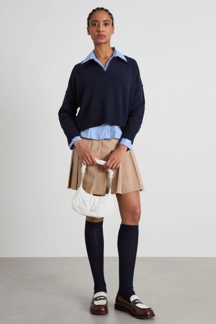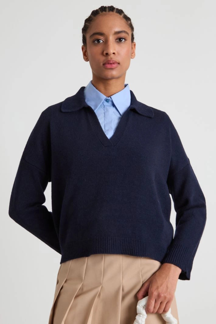 Straight-cut sweater in wool blend yarn, with a shirt collar and V-neckline, long dropped sleeves and ribbed edges.