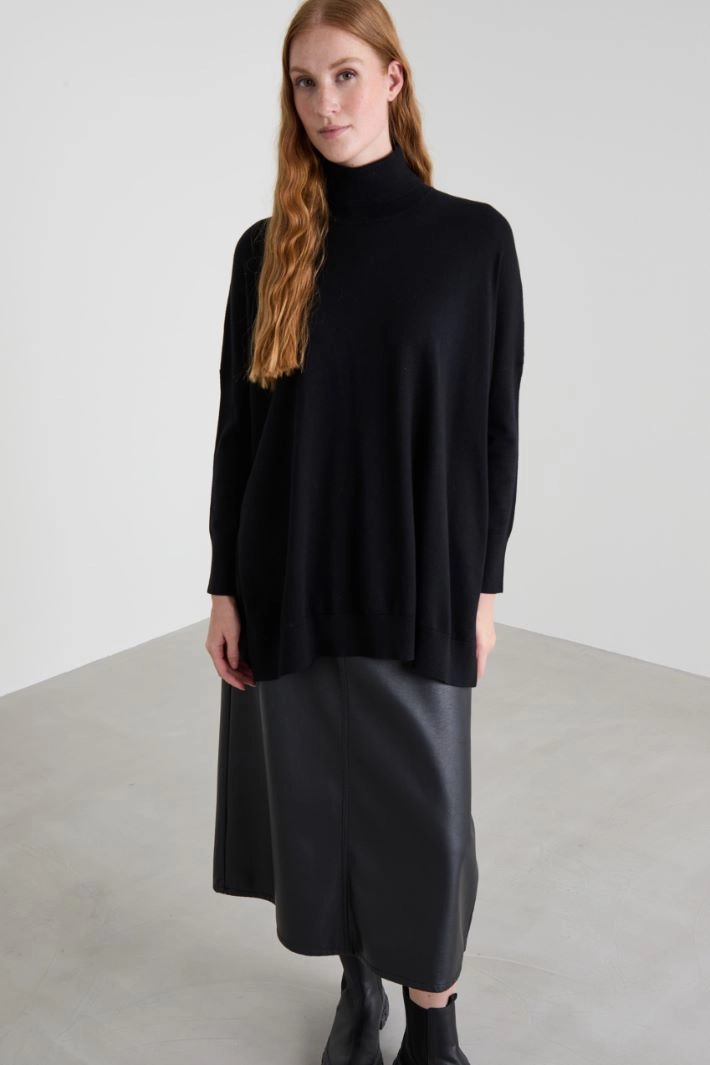 Oversized sweater in viscose blend yarn, with high turned-up neck, long dropped sleeves, side slits and asymmetrical hem. Ribbed trim.