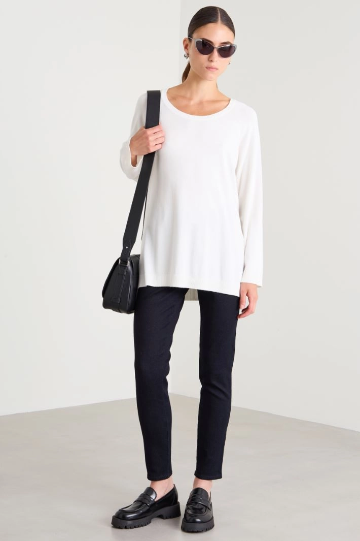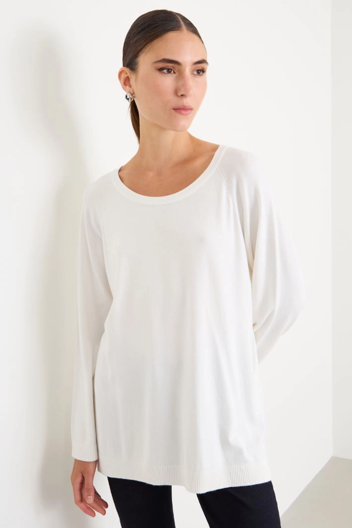 Straight-cut sweater in viscose blend yarn, with round neckline, long raglan sleeves and asymmetrical hem with side slits.