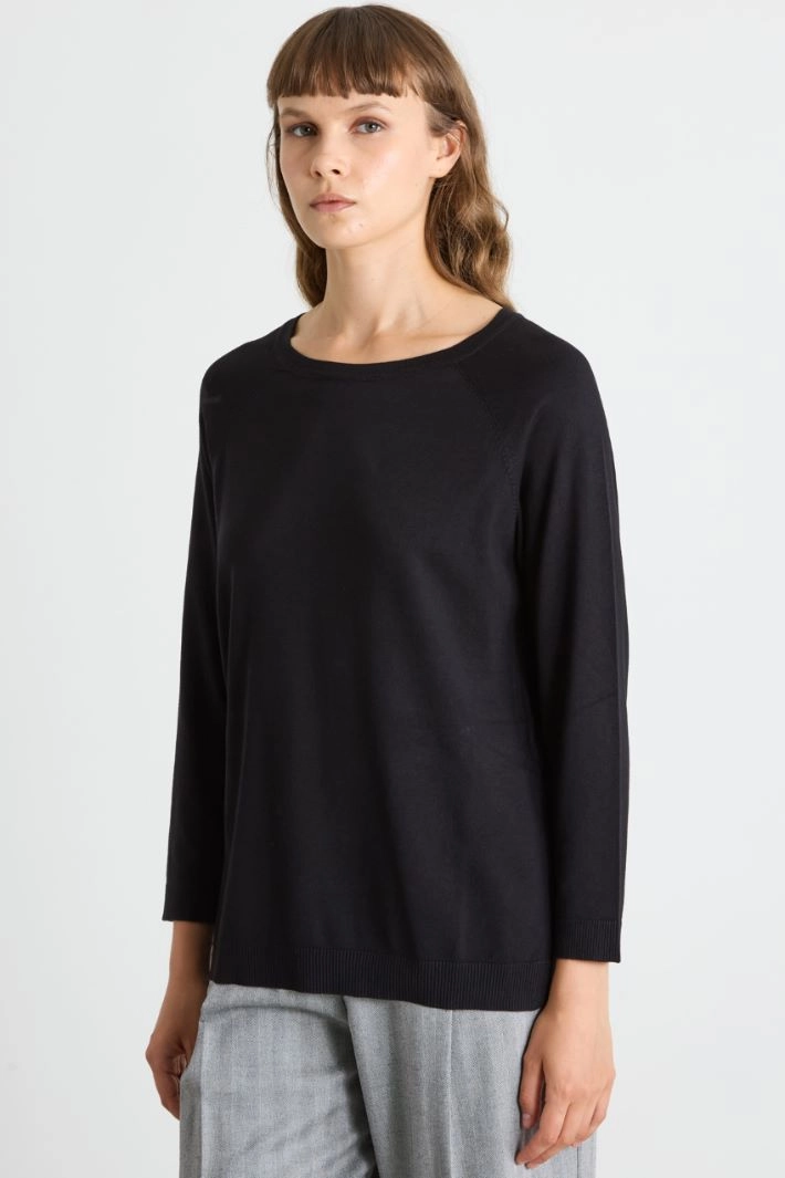 Straight-cut sweater in viscose blend yarn, with round neckline, long raglan sleeves and asymmetrical hem with side slits.