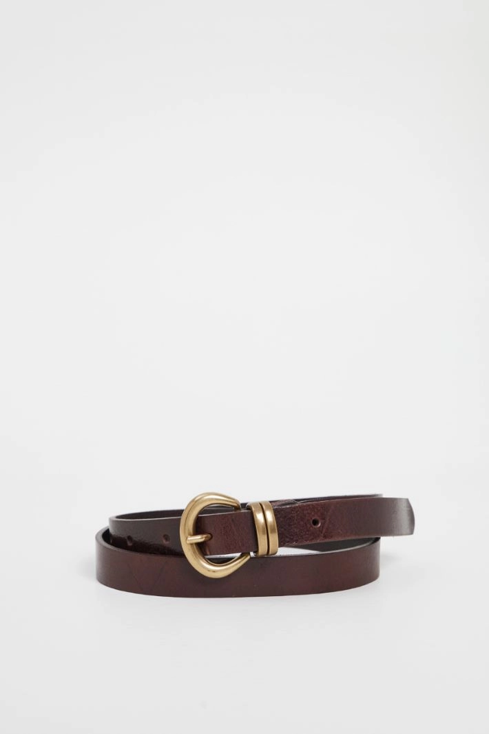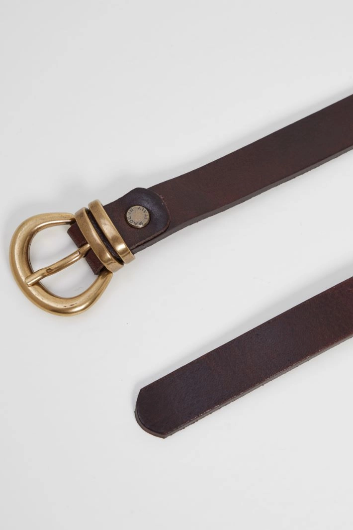 Belt in genuine leather with rounded buckle, pin and metal loop.