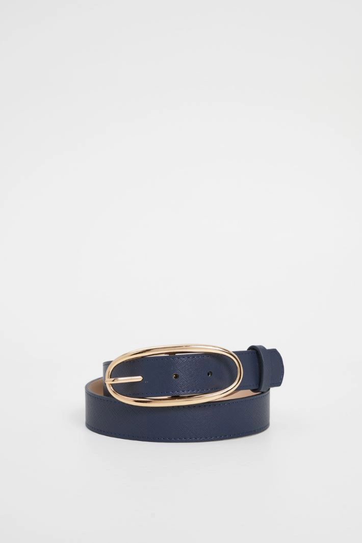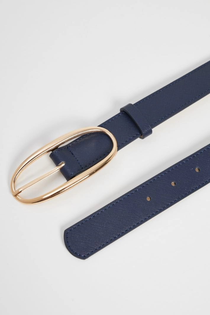Belt in saffiano effect faux leather, with single loop, oval buckle and metal pin.