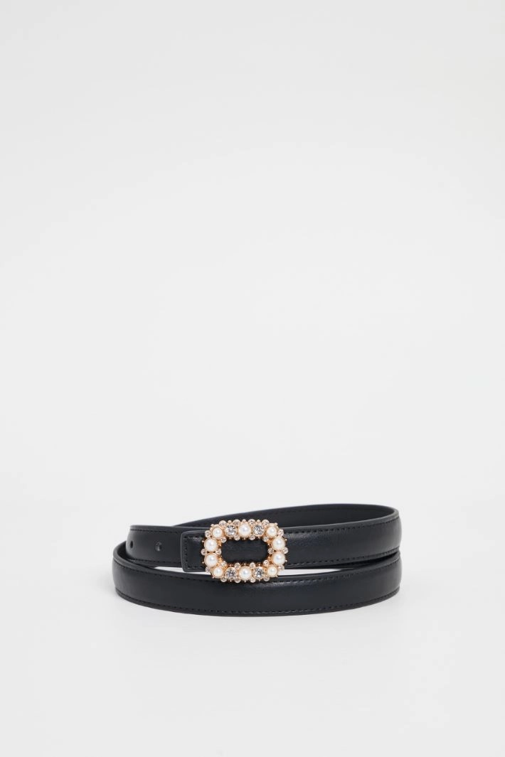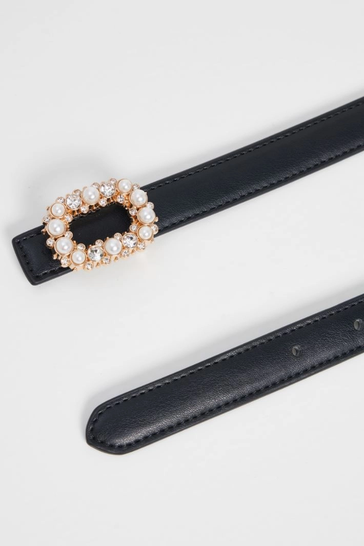Belt in smooth faux leather, with metal buckle and applied pearl and rhinestone motif.
