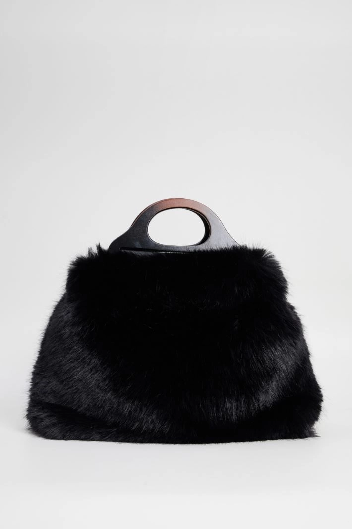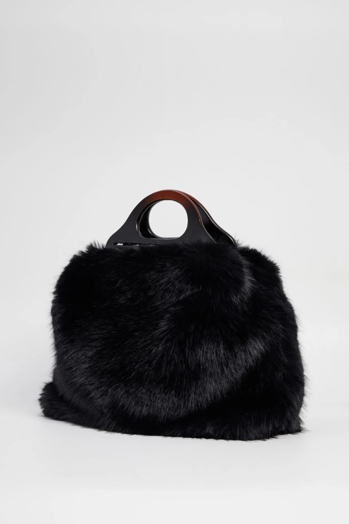 Faux fur shopper bag, with double wooden handles, lined interior with pocket and zip and hook closure.