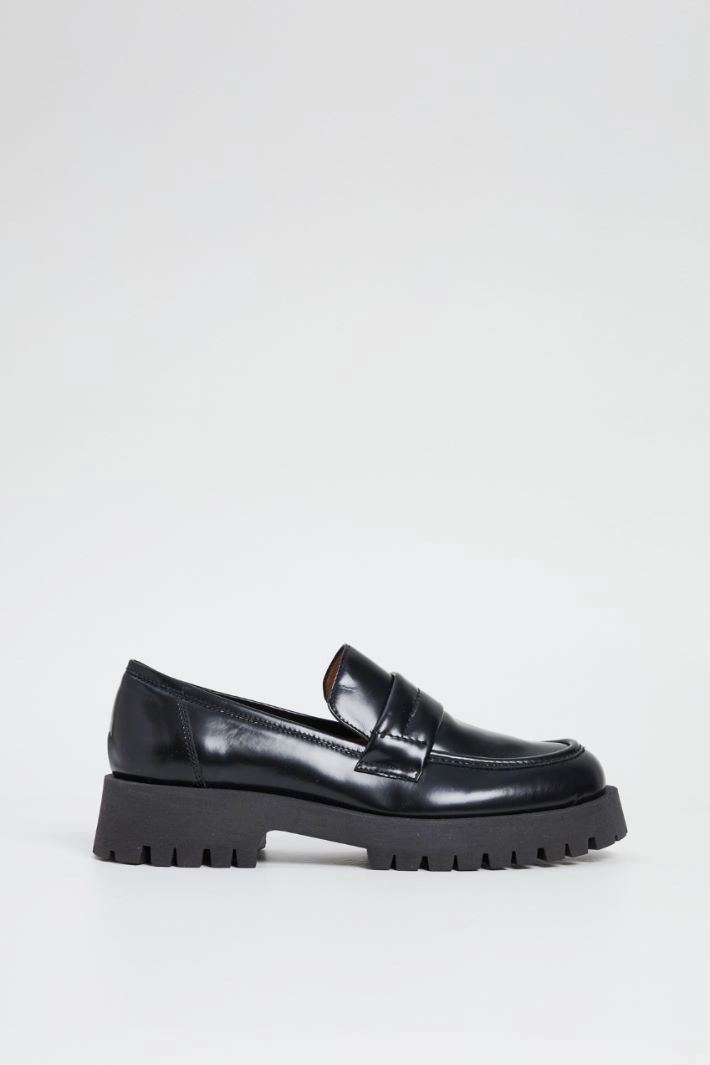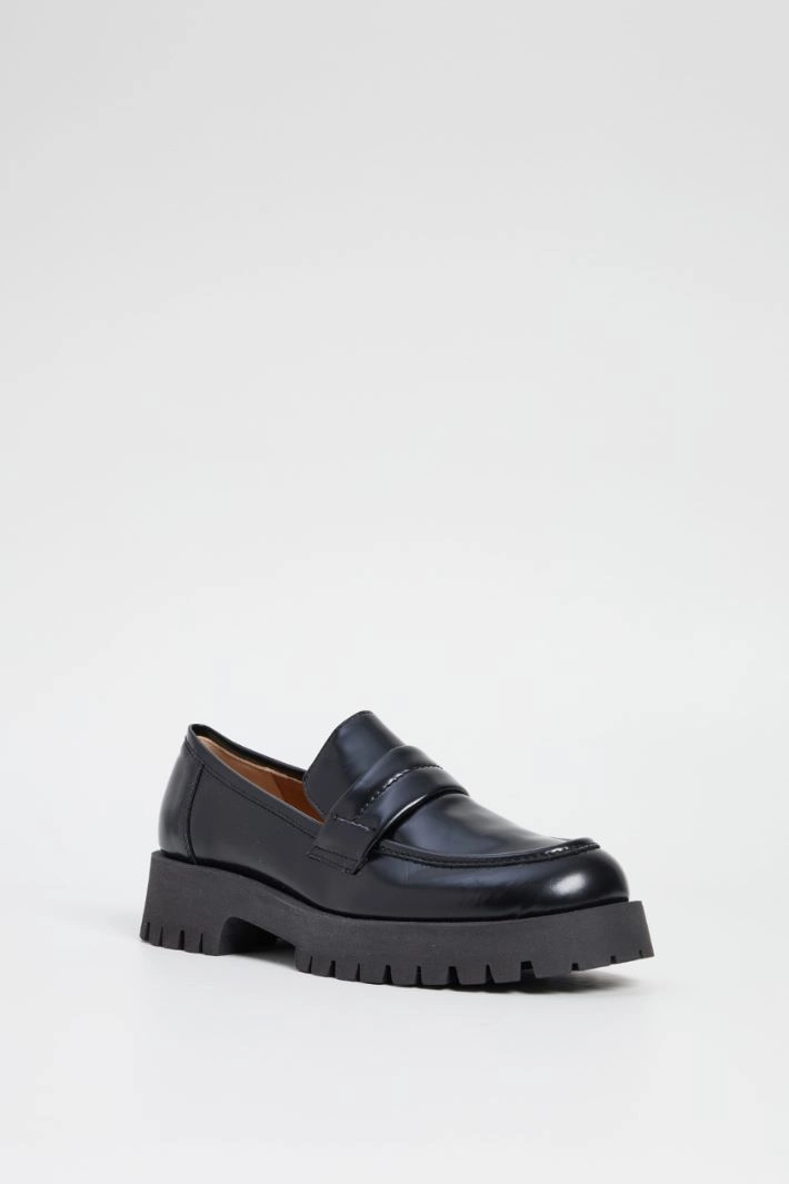 Moccasin in genuine shiny leather with stitching on the upper. Rubber trekking sole.