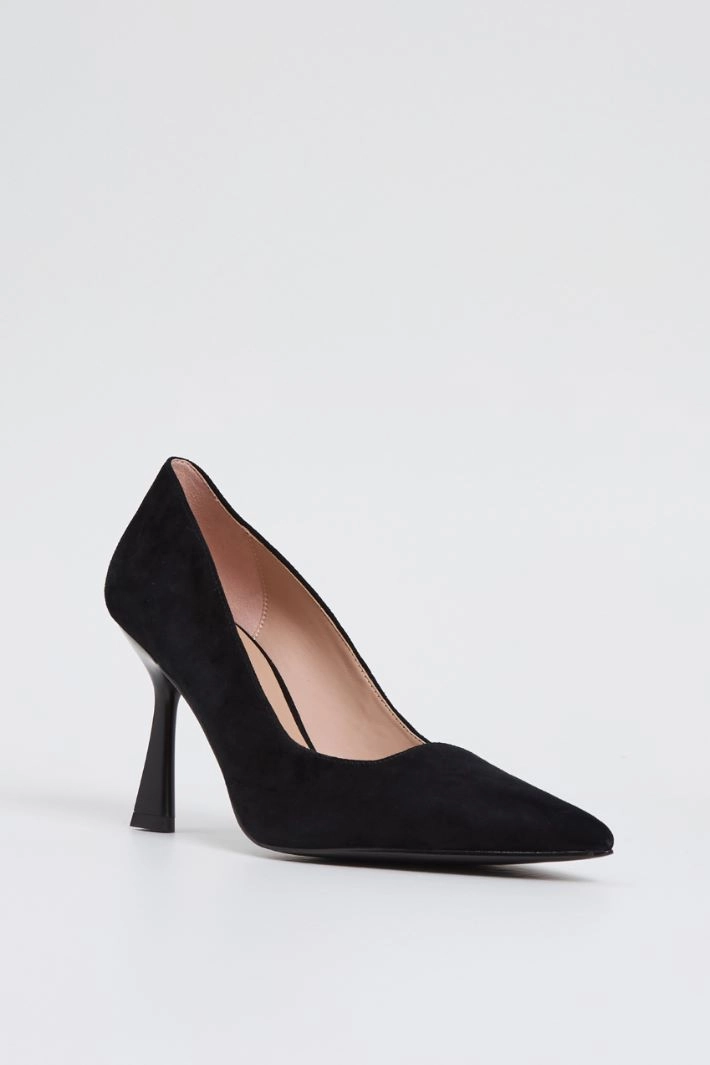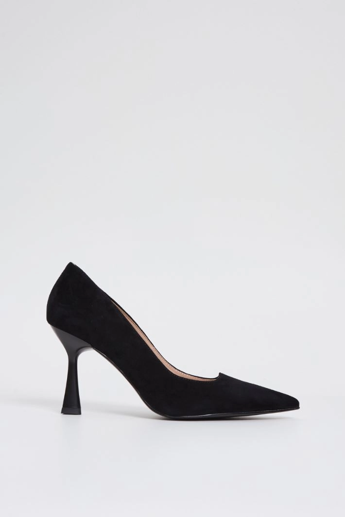 Pumps in genuine suede-effect leather, with square neckline, pointed toe and lacquered spool heel. Rubber sole.